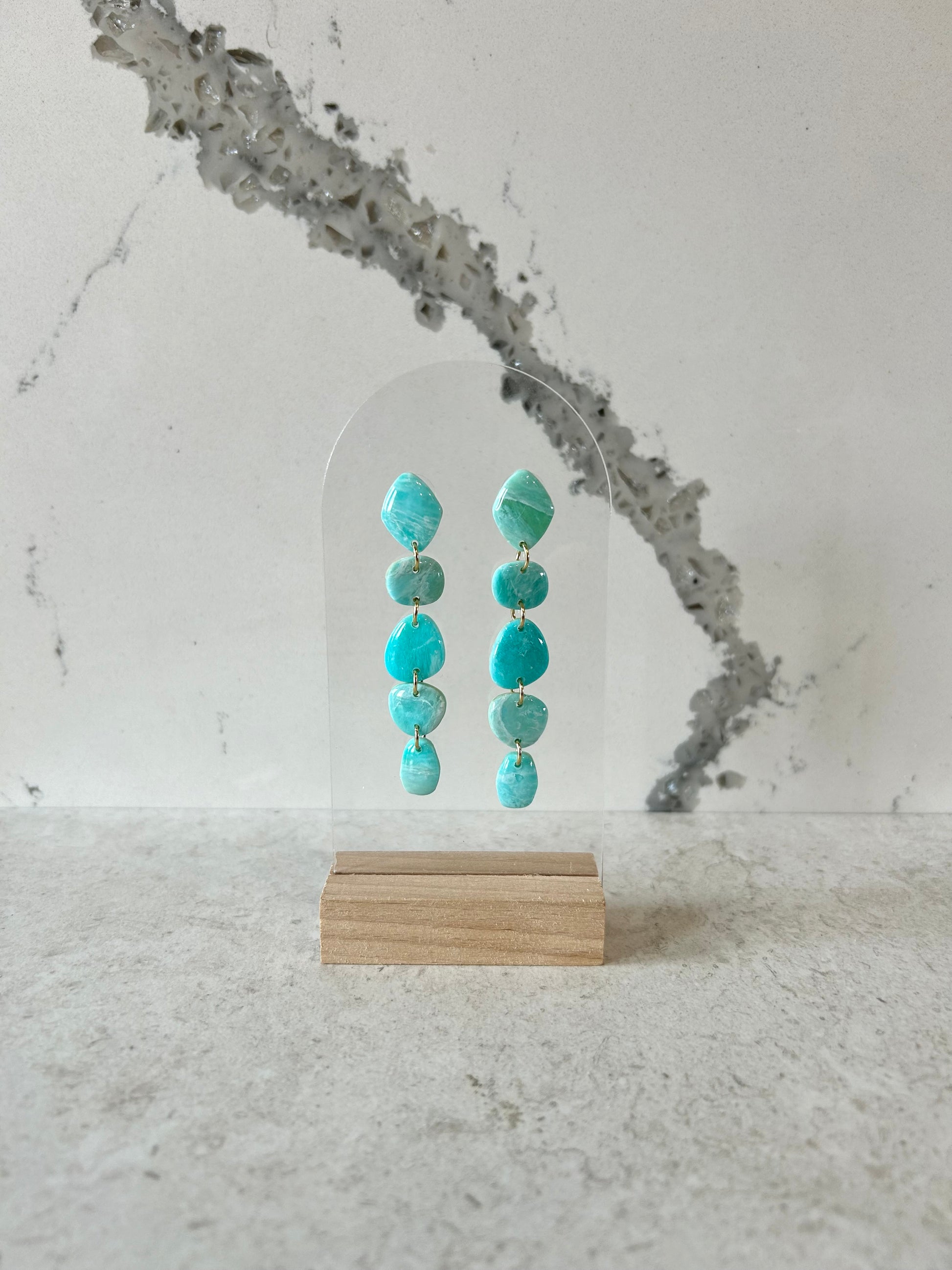 Lightweight polymer clay earrings in a beautiful shade of blue, designed to resemble faux stones found along the coast. These earrings are perfect for adding a pop of color to your outfit and capturing the essence of the ocean. The polymer clay material makes them comfortable to wear all day long, while the coastal-inspired design adds a touch of natural beauty to any look.