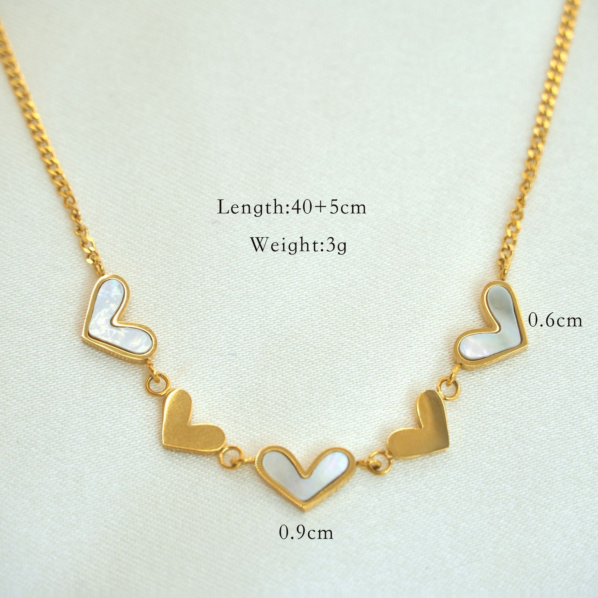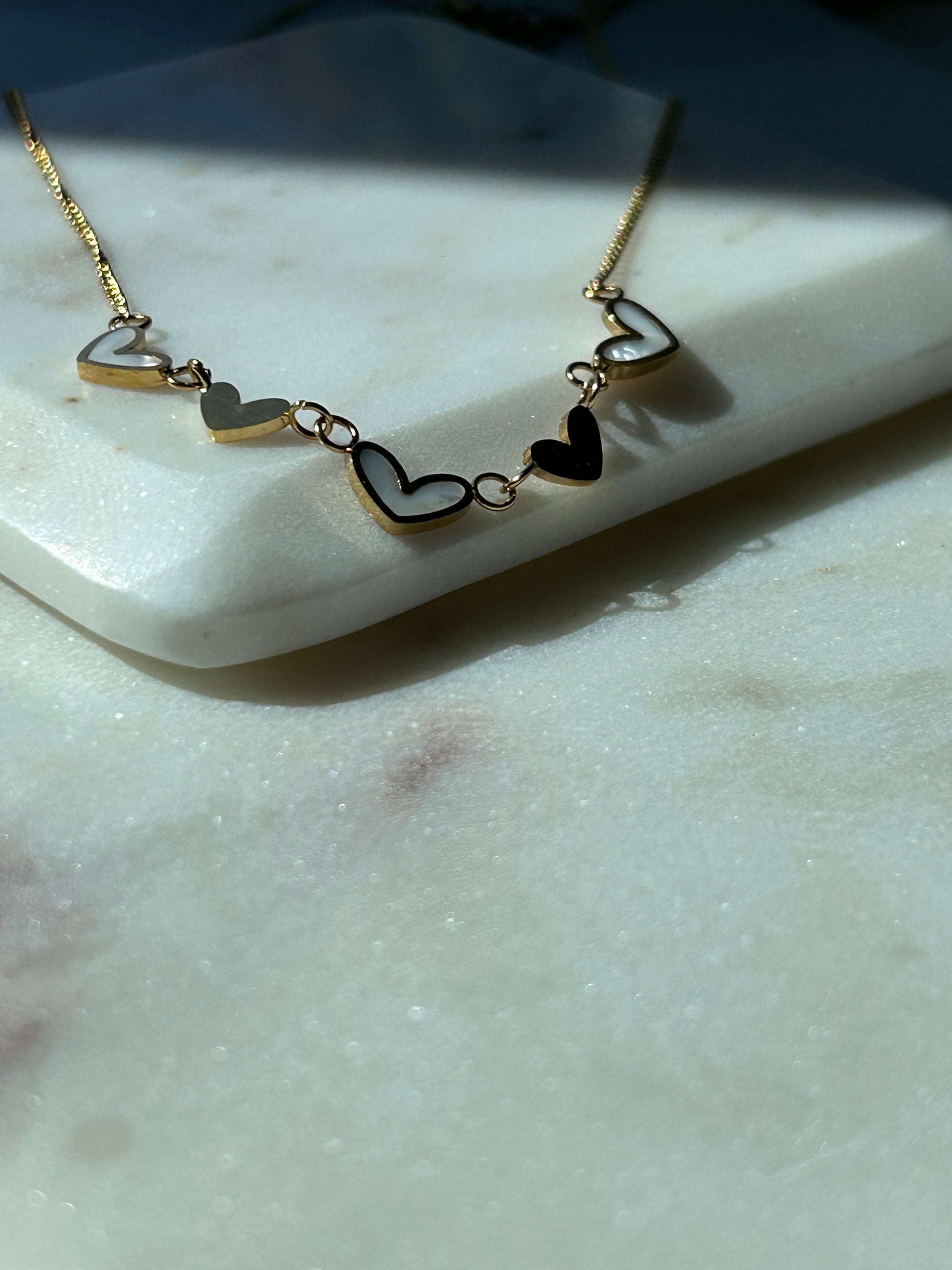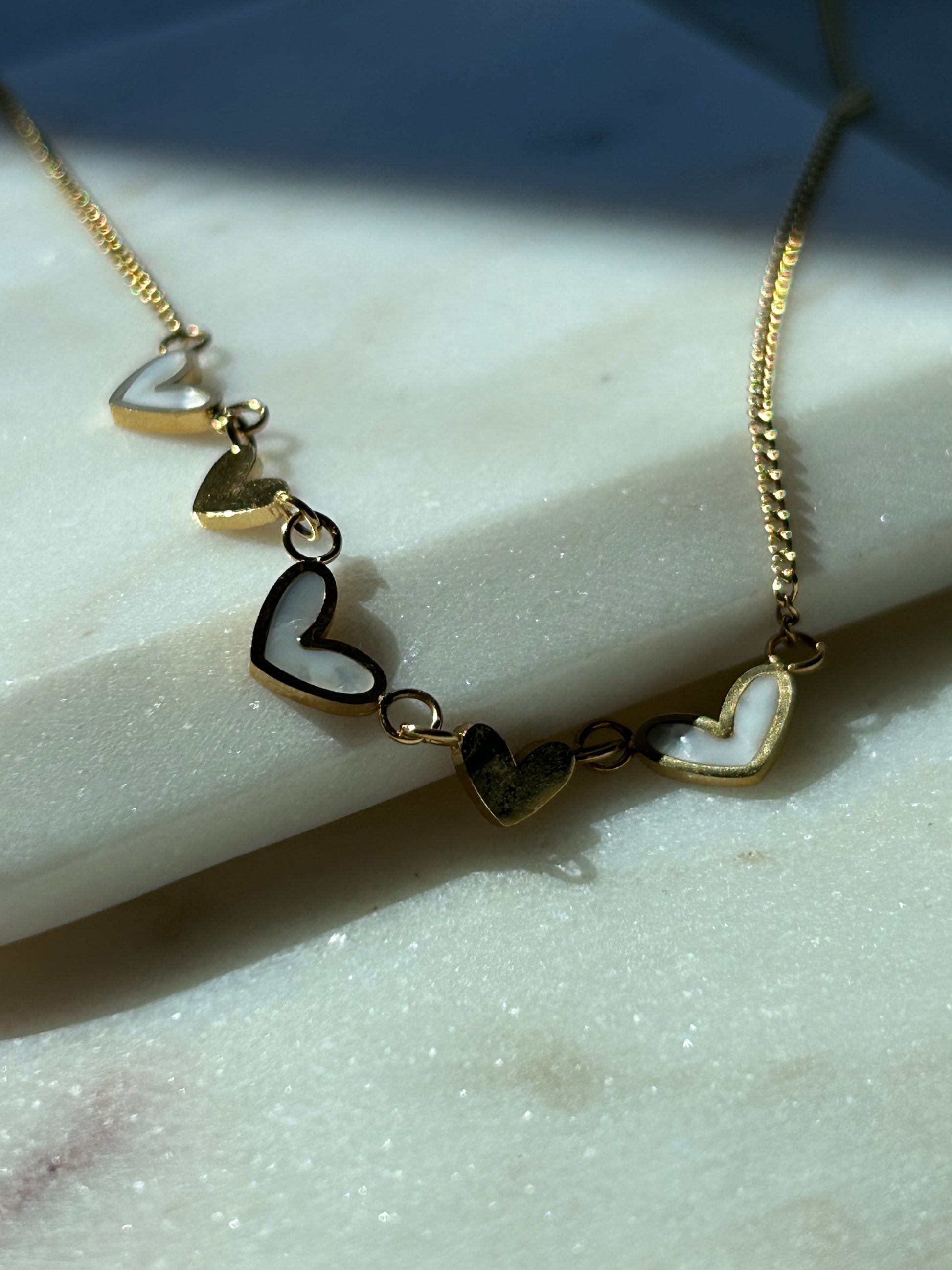 5 dainty gold & enamel pearl hearts linked together. The Golden Hour necklace is effortlessly feminine and easy to wear. It is a crowd favourite!
