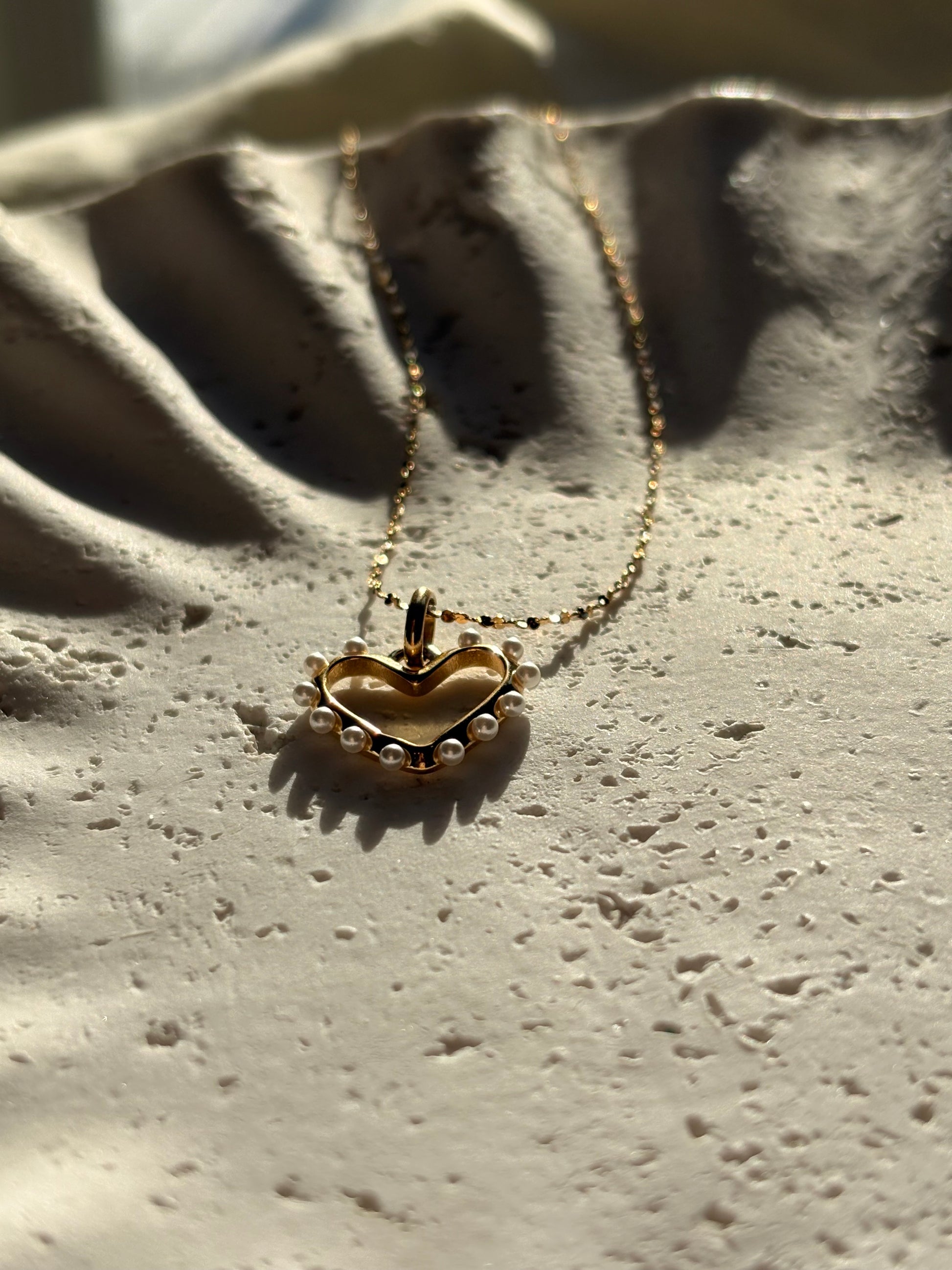 Beautiful dainty open heart framed pendant with tiny pearl accents. She is soft, feminine and perfect for the holidays! Hung on our favourite startdust chain ( 17.5 inches )