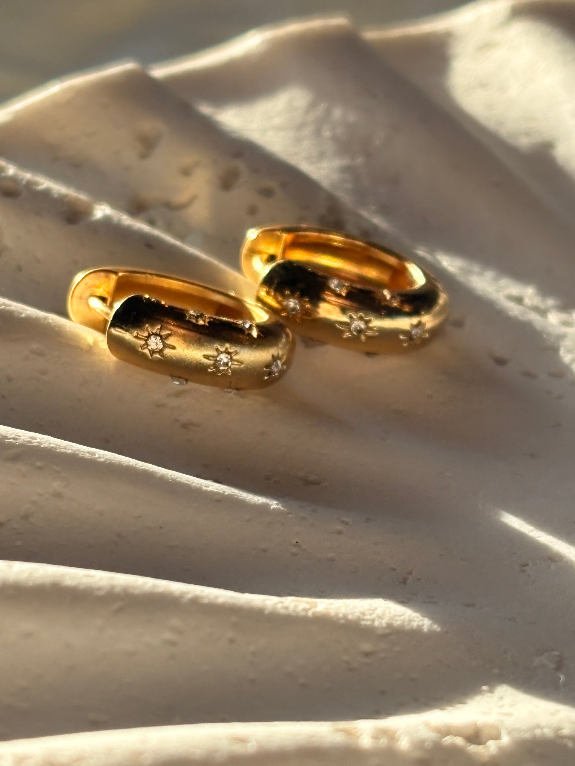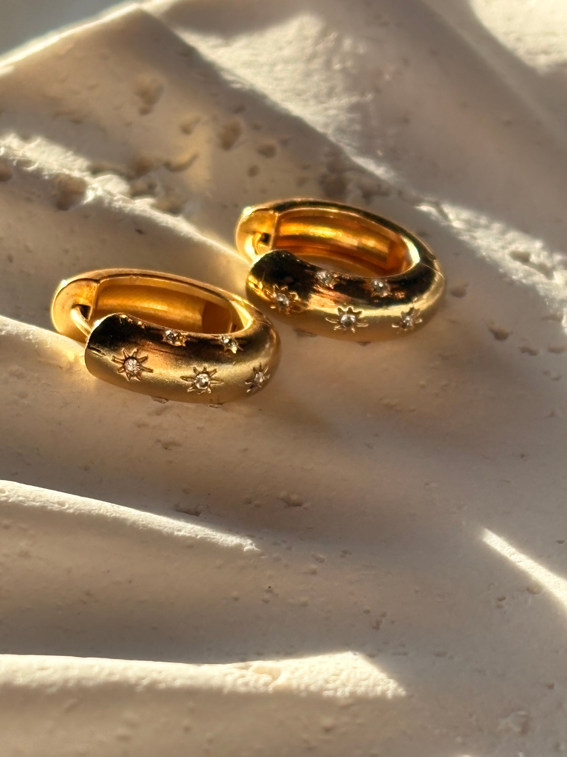 Small chunky Huggies with tiny star-studded detailing. The perfect everyday hoop with a subtle celestial glow!