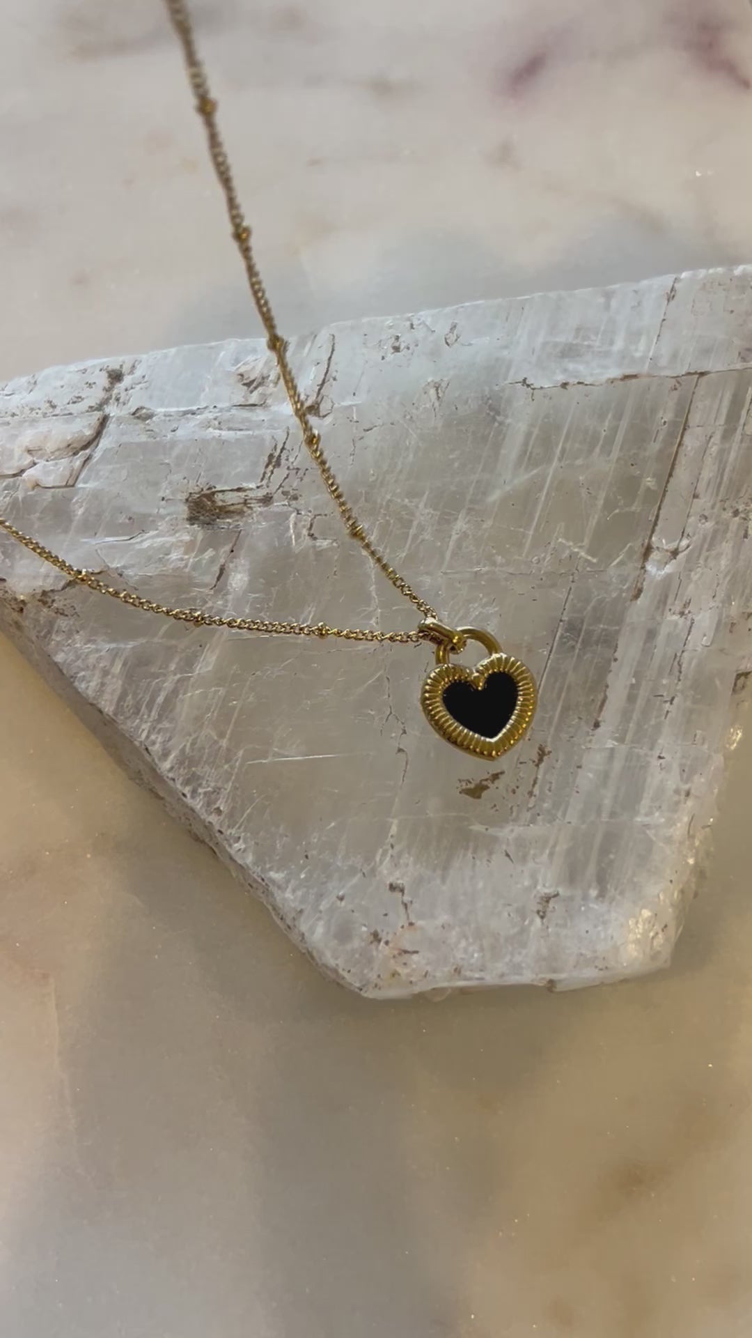 Introducing our elegant Exile necklace, a versatile and stylish accessory that offers two stunning looks in one. This necklace features a dainty heart-shaped pendant that is reversible, with a black onyx finish on one side and a lustrous pearl on the other, allowing you to switch between two chic styles effortlessly.