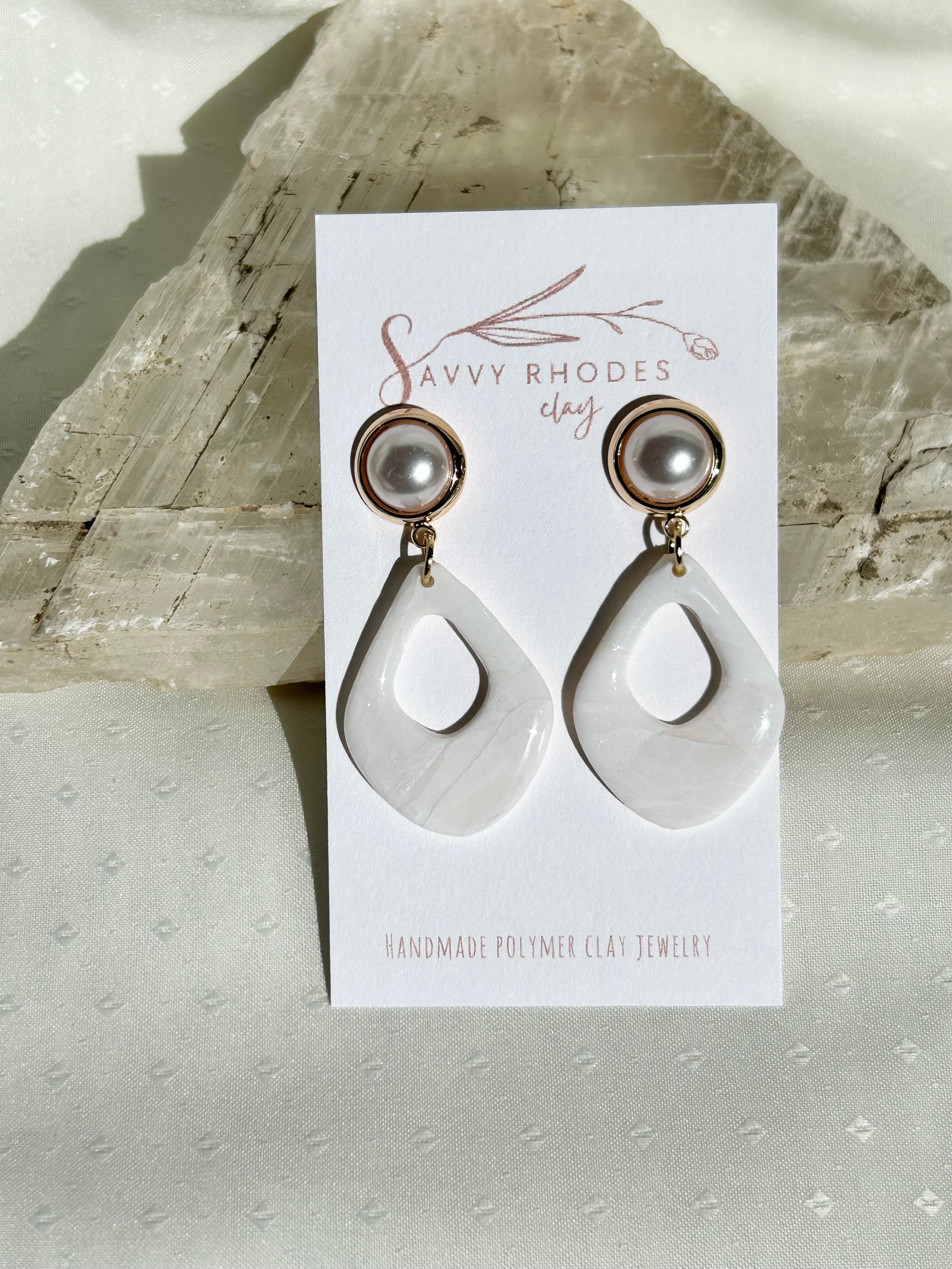 The combination of the polymer clay resined white quartz, pearl top, and elegant dangle design makes our Nika earrings a versatile and stylish accessory that will elevate any ensemble. Whether worn with a formal gown for a special event or paired with a casual outfit for a touch of glamour, these Polymer Clay Resined Elegant Dangle Earrings are sure to make a statement and leave a lasting impression.