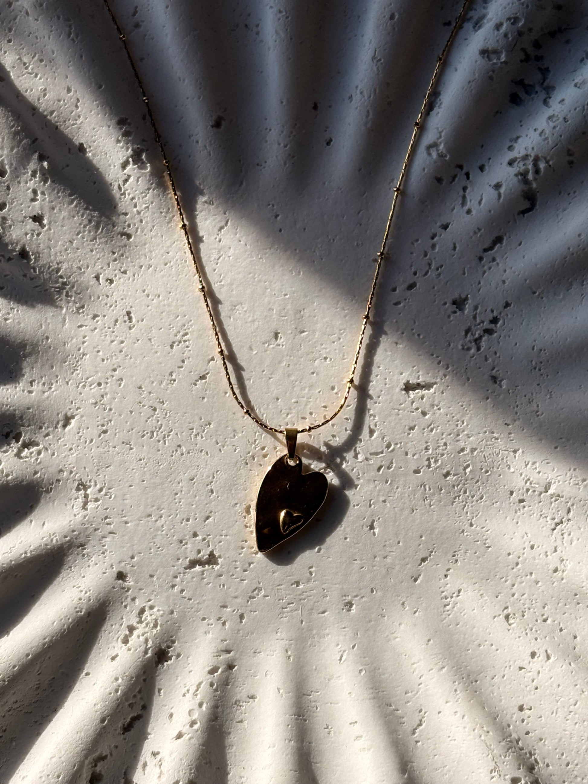 An asymmetrical, textured heart pendant that feels raw and real. Choose between a chunky figaro chain or a sleek bamboo joint chain—both sitting just over 17 inches. Effortless, unique, and made for everyday wear.